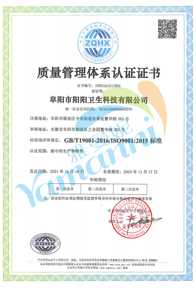質(zhì)量管理體系認證是指由取得質(zhì)量管理體系認證資格的第三方認證機構(gòu),依據(jù)正式發(fā)布的質(zhì)量管理體系標準,對企業(yè)的質(zhì)量管理體系實施評定,評定合格的由第三方機構(gòu)頒發(fā)質(zhì)量管理體系認證證書,并給予注冊公布,以證明企業(yè)質(zhì)量管理和質(zhì)量保證能力符合相應(yīng)標準或有能力按規(guī)定的質(zhì)量要求提供產(chǎn)品的活動。雅曼妮產(chǎn)品符合:GB/T19001-2016/ISO9001:2005標準