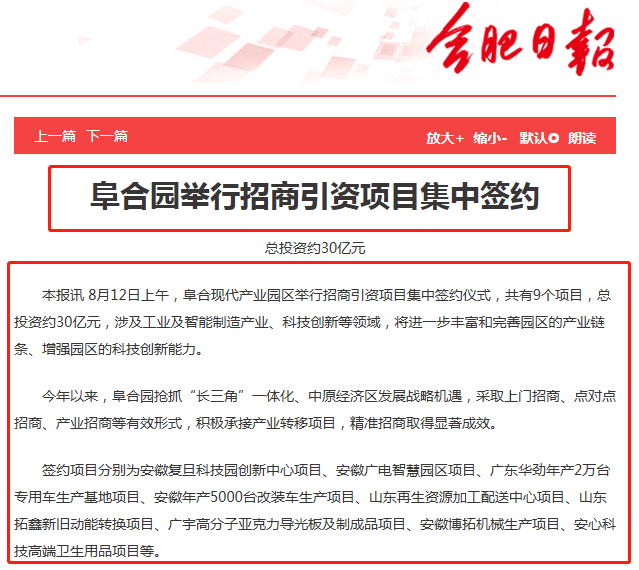 近日 阜合現(xiàn)代產(chǎn)業(yè)園區(qū)舉行招商引資項目 集中簽約儀式 共有9個項目簽約 總投資約30億元 涉及工業(yè)及智能制造產(chǎn)業(yè) 科技創(chuàng)新等領(lǐng)域 阜合園區(qū)是合肥、阜陽 兩市重點打造區(qū)域 將成為皖北地區(qū)重要的增長極 阜合園區(qū)是合肥、阜陽兩市重點打造區(qū)域 將成為皖北地區(qū)重要的增長極 “產(chǎn)城一體、四化同步、宜居宜業(yè) 轉(zhuǎn)型發(fā)展” 的示范區(qū)